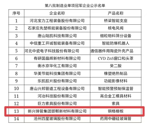 3月11日,国家工信部第八批制造业单项冠军企业完成公示,公司全资子公司星空体育电竞集团邯郸新材料有限公司(以下简称“邯郸新材料”)以钢格栅板产品榜上有名,这是公司继球墨铸铁管产品被工信部评为“制造业单项冠军产品”后,荣获的第二个国家级制造业单项冠军产品/企业称号。